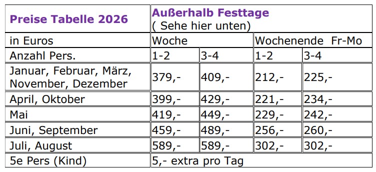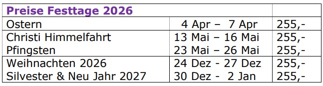 Bettwäsche: € 4,50 pro Person pro Wechsel.( bei selbst mitbringen: Deckbettbezug 140x200, Spannbettuch 90x200 und Kopfkissenbezug.