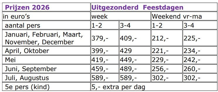Huisdier € 3,50 per dier per nacht. De woning is echter alleen geschikt voor één kleine tot middel grote hond. (aub. vooraf overleg). Wij